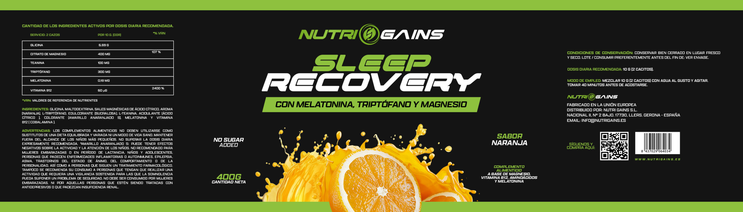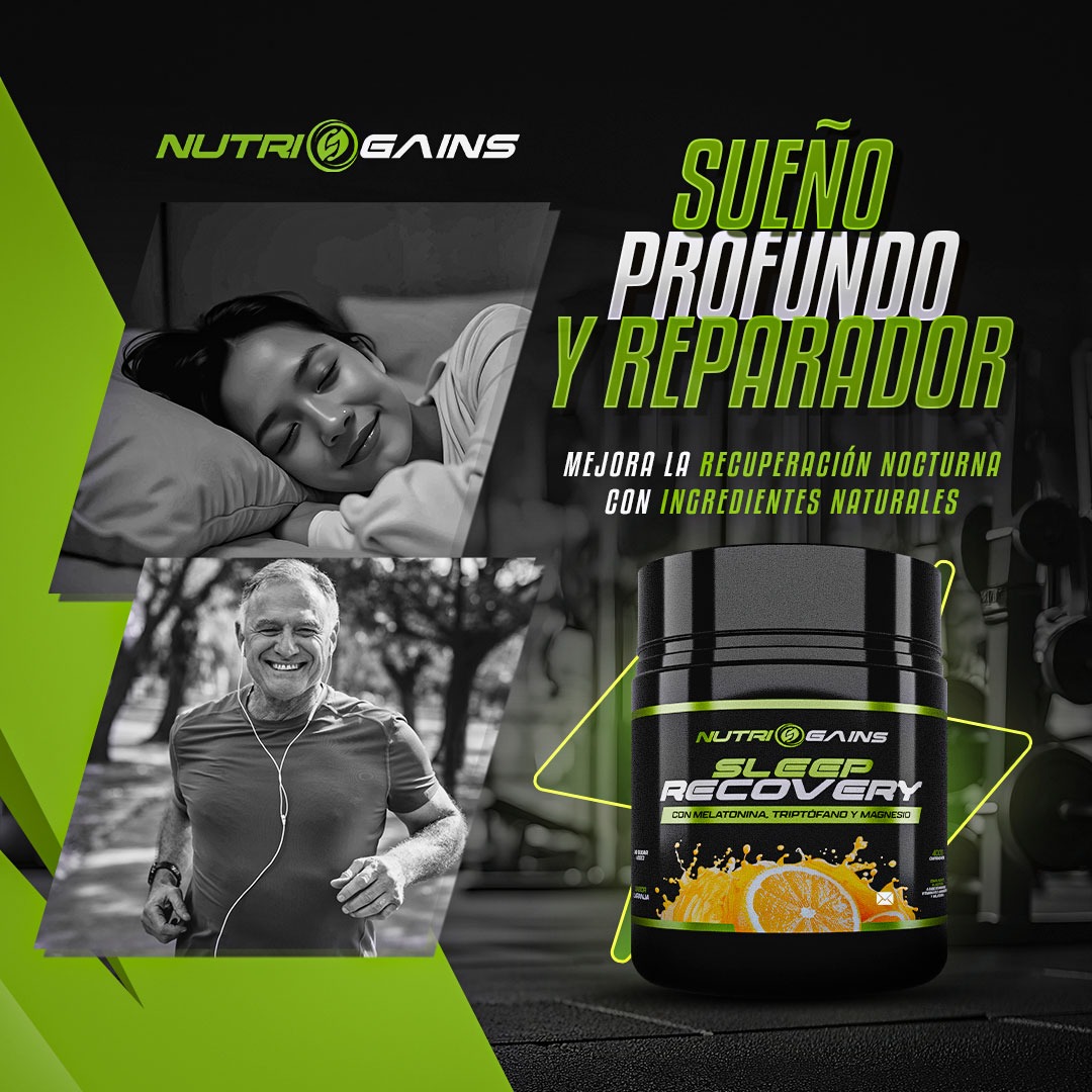 Sleep Recovery combina nutrientes específicos como glicina, triptófano, L-teanina, melatonina, magnesio y vitamina B12, que contribuyen al funcionamiento normal del sistema nervioso y a la reducción del cansancio y la fatiga.